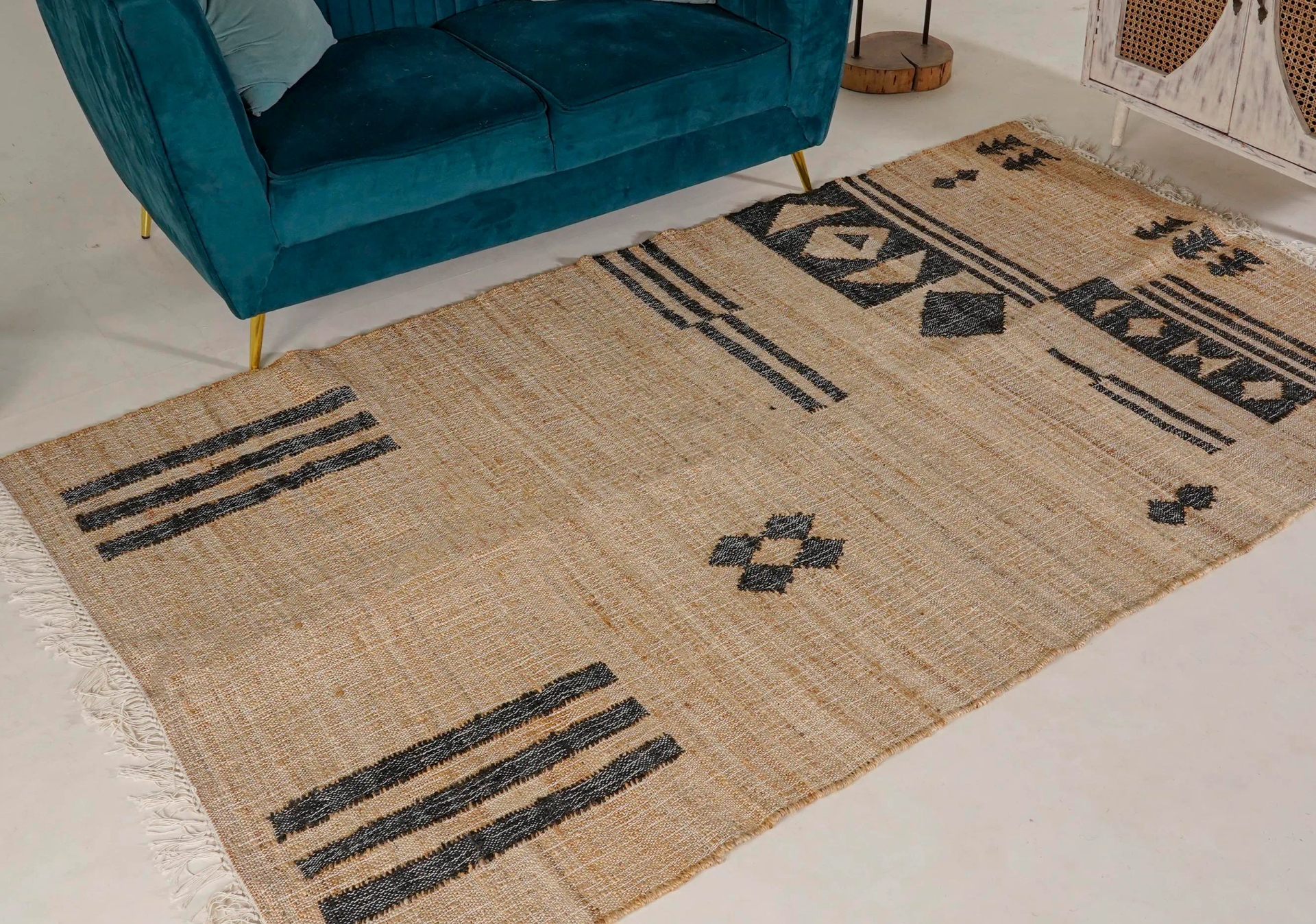 Bohemian Vintage Handwoven Cotton Jute Rug Natural Beige Jute Rug With Black Design Jute Rug Decorative Area Rug White Fringes Jute Rug Large Dhurrie Rug