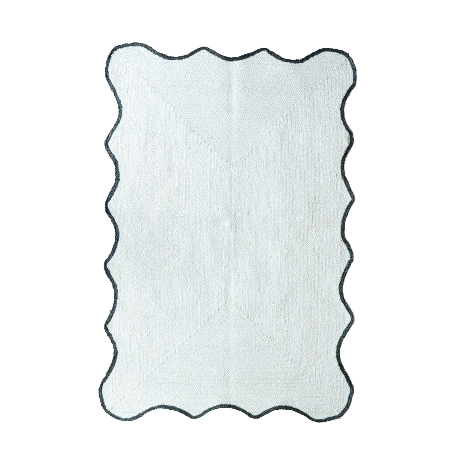 Hand Braided Scalloped Rectangle Jute Rug White with Wavy Edge Black Border