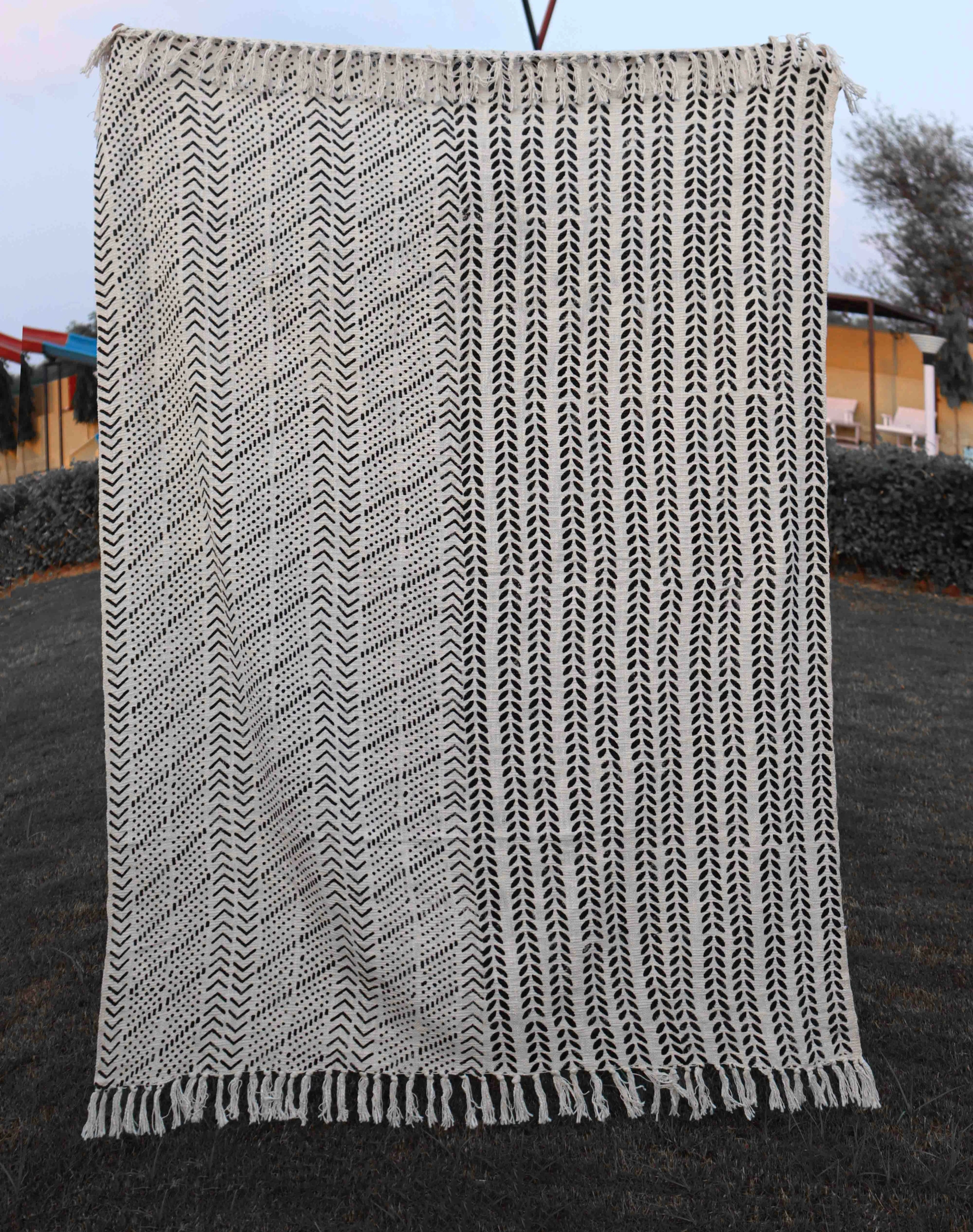 Handmade Rustic Throw Authentic African Style Decor for Home Hand Loom Blanket Boho Block Print Bed Throw Linen with Tassels White Throw With Black Design For Decor Home
