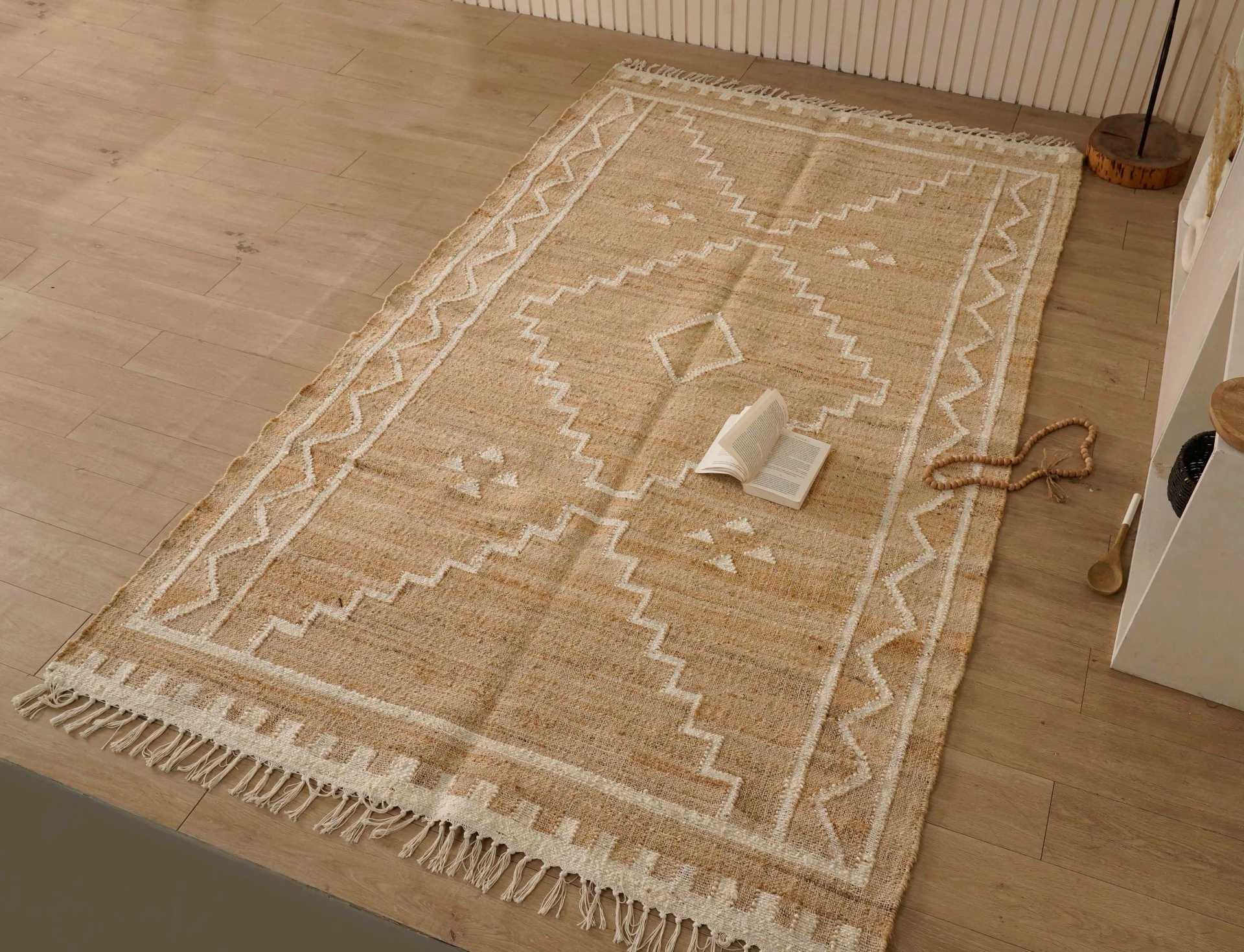 Natural Jute Fiber Cotton Hand Woven Bohemian Moroccan Inspired Rug Beige Jute Rug With White Pattern Rug For Decor Home And White Fringes Jute Rug